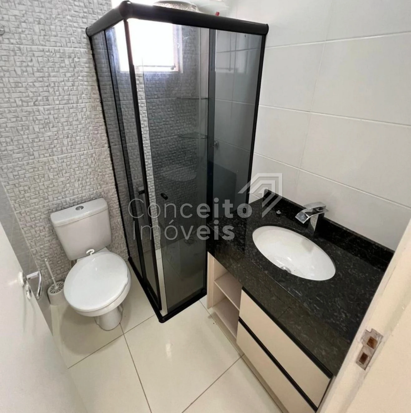 ✅ Banheiro social com armário, espelho, box e chuveiro elétrico,