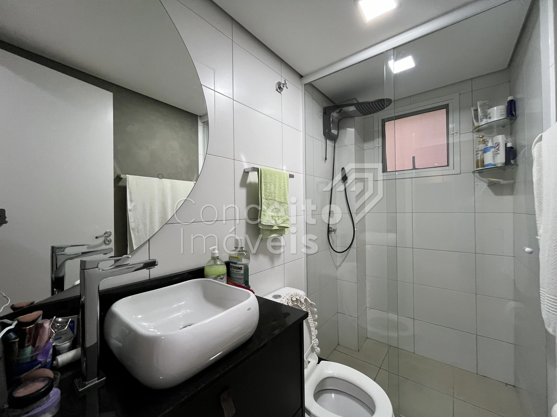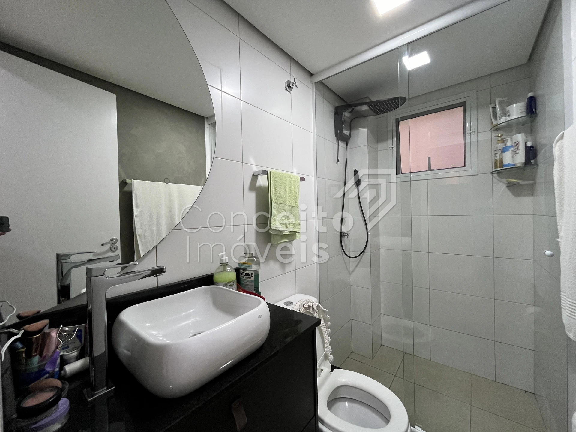 ✅ Banheiro social com armário, espelho, box e chuveiro