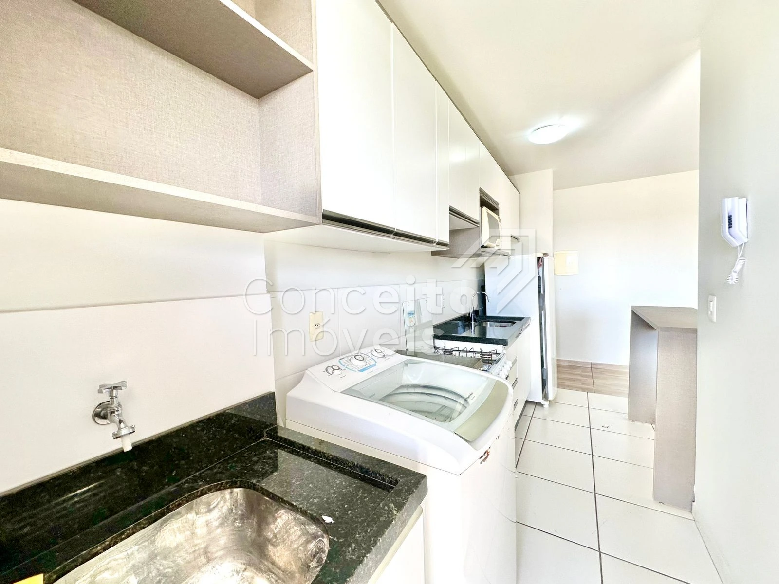 🍽️ Cozinha com armários modulados, geladeira, fogão, micro-ondas e área de serviço integrada com máquina de lavar e tanque