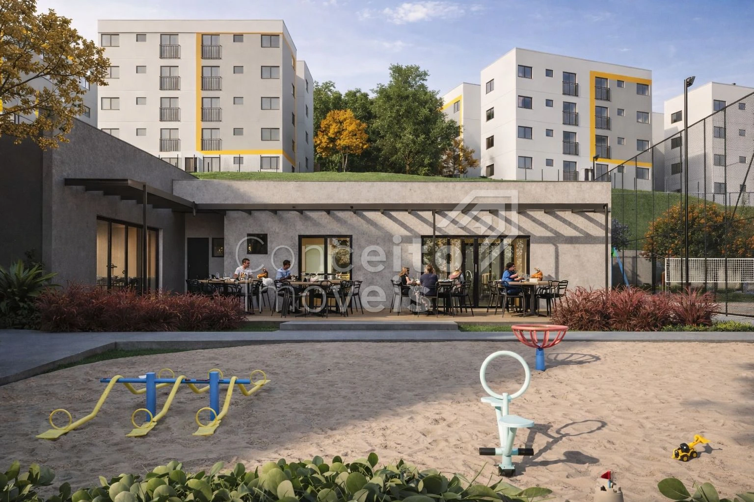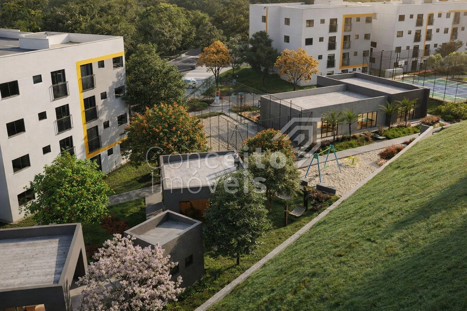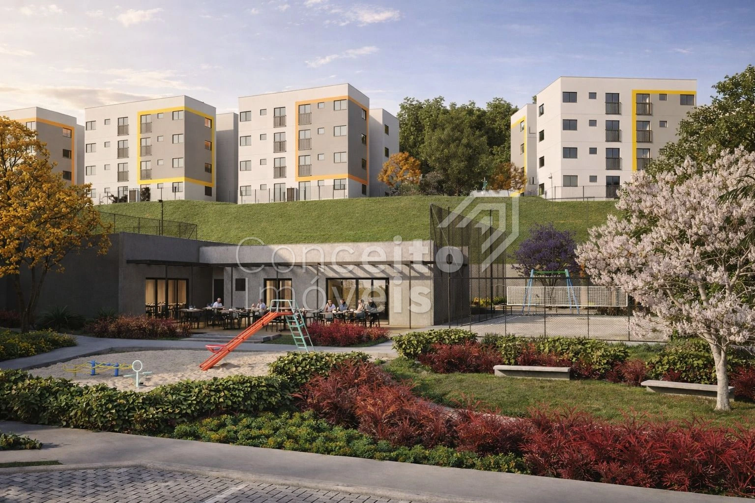 Playground, quadra esportiva e de beach tennis, academia, bicicletários, espaço pet, salão de jogos, quiosques com churrasqueira, horta, pomar e salão de festas com área externa.